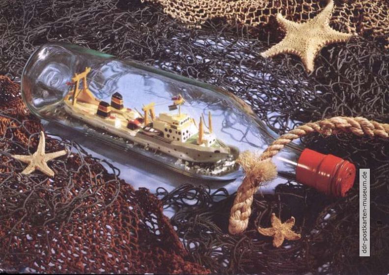Hace poco descubrí una de las fotos, la de arriba, en un sitio web sobre tarjetas de D.D.R. y pude entonces saber que el calendario que me habían ofrecido era de ese país. Lo que no sabía era que algunas de esas botellas habían sido producidas por Hans Euler, un marinero jubilado que consistió barcos en botellas por más de 40 años.