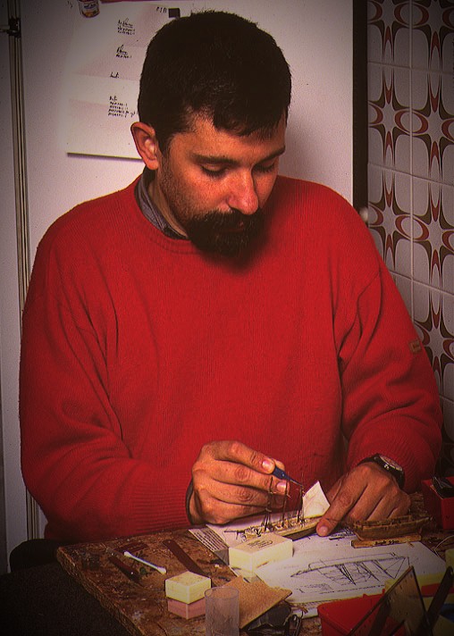 Mi primera miniatura dentro de una botella surgió de una visita a las islas de Faial y Pico en el archipiélago de las Azores en 1984. En Pico tomé una espléndida imagen del pueblo de Madalena enmarcado por la gran montaña. Para el velero consideré uno que estaba en el puerto de Horta, Faial, ¡una goleta preciosa!